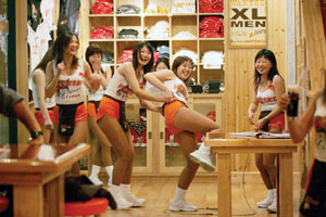 Scantily-clad waitresses in clingy shirts and orange high-cut shorts pose for a group photo. [Shanghai Star]