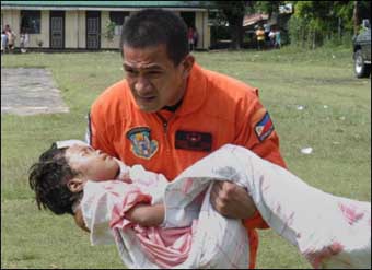 A Philippine Air Force rescue worker evacuates a young survivor from a flashflood in the main island of Luzon, northern Philippines, last week. At least 33 people were dead or missing in floods and landslides unleashed by a storm. [AFP]