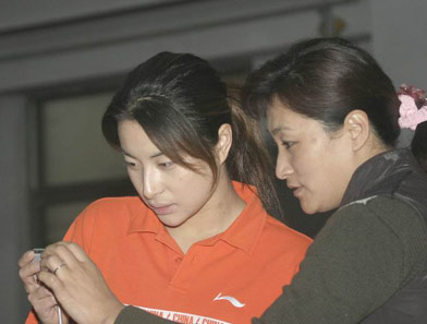 Guo Jingjing looks at the LCD of her digital camera with her coach at Chinese Diving Training Center situated in Baoding, North China's Hebei Province Novermber 30, 2004. Guo has returned to training as a 'turbulent' holiday after the Athens Olympics finished. [sohu]