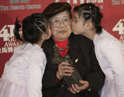 actress Yang Kuei Mei pose with their awards for best actor and actress at