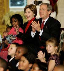 U.S. President George W. Bush and first lady Laura Bush applaud with schoolchildren and Santa Claus during a children's Christmas show in the East Room of the White House in Washington, December 6, 2004. Dozens of schoolchildren joined the president to sing Christmas Carols and watch a puppet show. [Reuters]