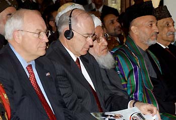 Vice President Dick Cheney, the highest-ranking American official to visit Afghanistan since the fall of the Taliban in 2001, and Secretary of Defense Donald Rumsfeld were among those who gave Karzai a standing ovation when he arrived. Karzai repeated the oath of allegiance read to him by Afghanistan's white-bearded chief justice, Fazl Hadi Shinwari. He then swore in his two vice presidents, Ahmad Zia Massood and Karim Khalili, members of the country's two largest ethnic minorities. Kabul was calm amid massive security for the ceremony, but overnight attacks near the Pakistani frontier that left 12 dead provided a strong reminder of threats to the nation's stability. In his inaugural address, Karzai said the hopes of ordinary Afghans would drive him during what is likely to be a tough five-year term. He reiterated his main pledges ¡ª cracking down on the booming opium trade, disarming militias and lifting living standards. "We have now left a hard and dark past behind us and today we are opening a new chapter in our history in a spirit of friendship with the international community," Karzai said, speaking in Pashto and Dari, Afghanistan's two main languages. He said the fight against terrorism was "not yet over" and urged continued international aid and cooperation to defeat increasing links between extremists and drug-trafficking. "The same cooperation has led to the rebuilding of the Afghan state and significant progress in restoring peace, stability and security to our country." Wary of attacks by Taliban or al-Qaida militants, Afghan and international forces launched their biggest security operation since the Oct. 9 election that gave Karzai, who had been interim leader, a landslide victory. Hours before the ceremony, dozens of insurgents armed with assault rifles and rockets attacked an Afghan military base in Khost province, sparking a firefight that left four Afghan soldiers and at least six militants dead, an Afghan commander said. Also in Khost, insurgents opened fire on a U.S. patrol, which returned fire and killed two of the assailants, U.S. spokesman Maj. Mark McCann said. No Americans were reported hurt. Militants also tried to launch a rocket toward Kabul on Monday evening, but it landed harmlessly on a cattle farm outside the city limits, a NATO spokesman said. Cheney, arriving at the main U.S. base north of Kabul earlier Tuesday, congratulated some of the 18,000 U.S. troops here for helping give democracy a chance to take root. "For the first time the people of this country are looking confident about the future of freedom and peace," Cheney said. "Freedom still has enemies here in Afghanistan, and you are here to make those enemies miserable." Before the ceremony, Karzai thanked the United States, his main sponsor, for its help. "Without that help, Afghanistan would be in the hands of terrorists," he said. "Terrorism as a force is gone. As individuals they are all around and we will continue to look for them."
