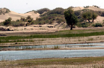 A satellite picture taken in August 2002 showed the center of Taitema Lake, where the Tarim River empties, has shifted to the western side of a trunk highway in the region, said Yuan Guoying, a research fellow with the Environmental Protection Institute of northwestern Xinjiang Uygur Autonomous Region. On the 1965 edition of the regional map, however, the lake had been about 20km east of the place where the highway was later built, Yuan said yesterday. Taitema Lake is located in Ruoqiang County of the Mongolian Autonomous Prefecture of Bayingolin, in the central eastern part of Xinjiang. The 1,321km Tarim River, known as the mother river for people in southern Xinjiang, flows into Taitema Lake. Yuan said he first proposed the hypothesis about the lake's moving westward in August 2003, when he accompanied a group of Chinese and German experts on a field survey on the ecosystem at the lower reaches of the Tarim River, which is sandwiched between the Taklimakan and Kuruktag deserts. Yuan visited the lake again this summer to prove his hypothesis. "Even in the rainy season, water from the swelling Tarim River refused to flow eastward to where the lake had been in the past," he said. |