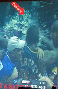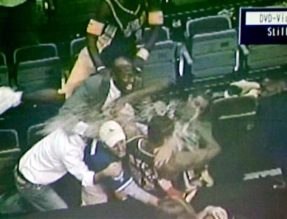 That sparked an initial skirmish, and Artest retreated to the scorer's table while the referees restored calm. But then Artest was hit by the cup, and he stormed into the stands, throwing punches as he climbed over seats.