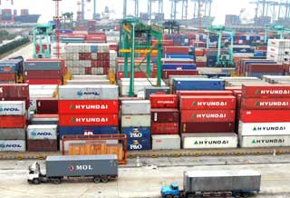 Trucks are busy transporting containers at a container terminal of the Shanghai Port December 9, 2004. China's foreign trade volume exceeded the US$1 trillion mark by the end of November. [newsphoto]