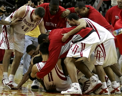 McGrady was mobbed by teammates near midcourt, while red-and-white confetti poured from the roof. The Spurs watched the celebration then walked off the court in stunned silence.