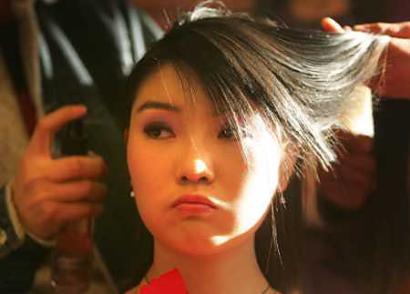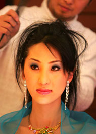 A competitor in China's first artificial beauty pageant receives final touches before the opening presentation in Beijing December 12, 2004. The finals for Miss Artificial Beauty are due to be held Saturday December 18, 2004, when contestants ranging from 17 to 62 years-old will parade their surgical nips and tucks-- enhancements once banned in beauty contests. Cosmetic surgery has become popular in China. [Reuters]