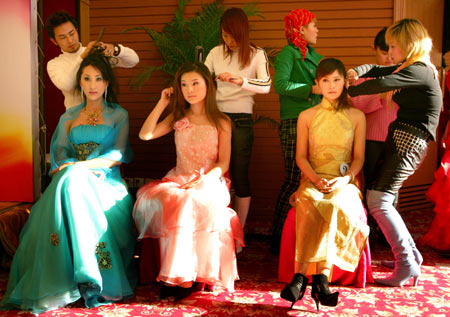 Competitors in China's first artificial beauty pageant receive final touches before the opening presentation in Beijing December 12, 2004.[Reuters]