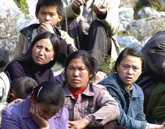 Relatives of the 36 miners trapped in the flooded mine wait anxiously for news about the fate of the miners at a hill near the mine in Sinan county, Guizhou Province, December 13, 2004. Rescue operation is underway to save the trapped workers. [Xinhua]