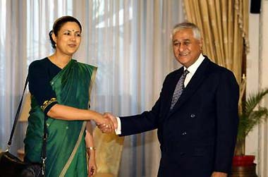 Pakistan's Additional Secretary of the Foreign Office Tariq Osman Hyder (R) greets his Indian counterpart Meera Shankar upon her arrival at the Foreign Ministry for talks in Islamabad December 14, 2004. [AP]