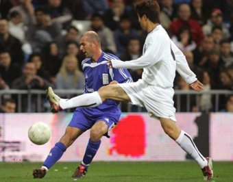 Deportivo La Coruna striker Diego Tristan scored twice while Spain and Real Madrid captain Raul Gonzalez and Switzerland's Hakan Yakin also netted for Zidane's team. Luis Figo, rally driver Carlos Sainz - with a comic penalty taken three times - Argentina's Juan Pablo Sorin and Portugal's Ricardo Costa all replied for Ronaldo's side.