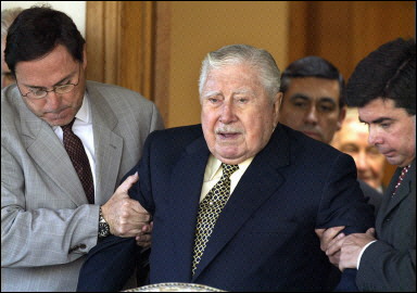 Former Chilean dictator Augusto Pinochet (C) is helped to walk during a public appearence in September 2003. The Military Hospital of Santiago confirmed that Pinochet was hospitalized after suffering a stroke. [AFP]