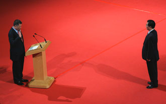 Administrative Region are sworn into office before President Hu Jintao (R)