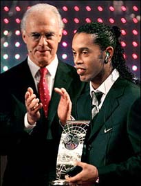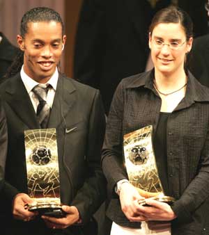 Ronaldinho has transformed Barcelona since arriving from Paris St Germain in 2003 and they lead the Primera Liga by nine points. Unlike his rivals for the award, organised by world soccer's governing body FIFA, Ronaldinho did not win a major club trophy this year. Ronaldinho did not take part in the Copa America won by Brazil as he was rested along with Ronaldo and Roberto Carlos. He is the fourth Brazilian to capture the award since its introduction in 1991 after Romario (1994), three times winner Ronaldo (1996, 1997 and 2002) and Rivaldo (1999). Remarkably, they all won the award when playing for Barcelona, though after his first success Ronaldo was with Inter Milan in 1997 and Real Madrid in 2002. Germany's Birgit Prinz won women's player of the year, the Presidents' Award went to Haiti for promoting the match for peace against Brazil and Brazil took the Fair Play award.