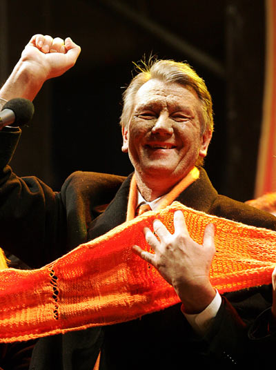 Ukrainian opposition leader Viktor Yushchenko greets supporters during a rally in Kiev's main Independence Square December 27, 2004. Western-leaning opposition leader Viktor Yushchenko claimed victory on Monday in a re-run of Ukraine's rigged presidential election, hailing the beginning of a new era in the former Soviet republic. [Reuters]