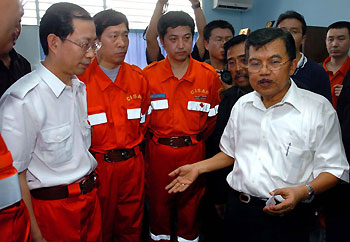 Jusuf Kalla (front right), vice-president of Indonesia, meets on Friday with the 35-member Chinese rescue team, which arrived on the same day in the North Sumatra capital of Medan. The team, headed by Zhao Heping (first left), deputy director of China Seismological Bureau, is to join the international relief efforts in Aceh Province, where more than 80,000 people were killed in the 9.0 earthquake-triggered tsunami. The team departed from Beijing on Thursday.[newsphoto]