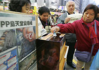 Hong Kong residents donate money on Friday during a ceremony at Causeway Bay to help tsunami-hit victims in Southern and Southeastern Asia. The donation was organized by the Democratic Alliance for the Betterment of Hong Kong and other agencies.[newsphoto]