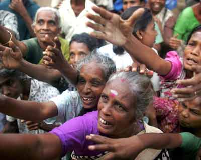 as they are unloaded from an aid truck in Karaitivu on Sri Lanka's east