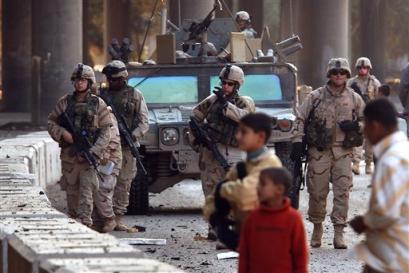 U.S. soldiers secure the main Green Zone checkpoint after a car bombing, in Baghdad, Monday, Jan. 3, 2005. The incident occurred at the U.S.-manned checkpoint to the Green Zone, the heavily fortified area that houses the U.S. Embassy and Iraqi government offices, U.S. Embassy spokesman Bob Callahan said. U.S. troops surrounded a burning SUV at the scene. [AP]