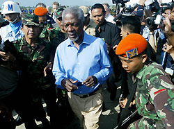 U.N. Secretary-General Kofi Annan is escorted by Indonesian soldiers as he arrives at an airport in the tsunami-hit city of Banda Aceh on the Indonesian island of Sumatra January 7, 2005. [Reuters]