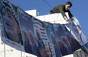 A Palestinian boy hangs election posters of presidential candidate Mahmoud Abbas and the late Yasser Arafat in the West Bank city of Hebron January 8, 2005. [Reuters]
