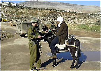 An Israeli border guard checks the ID of a Palestinian man at the Salem checkpoint in Izmut north of the West Bank city of Nablus.[AFP]