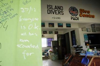 A message scribbled on a wall of a diving center in Thailand's tourist island of Phi Phi, January 2, 2005 after the quake-triggered tsunami that battered the islands of southern Thailand. [Reuters]