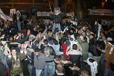 candidate Mahmoud Abbas celebrate under a huge portrait of him after the