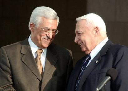 Israeli Prime Minister Ariel Sharon, right, and then-Palestinian Prime Minister Mahmoud Abbas, also known as Abu Mazen, talk prior to their meeting to discuss peace moves, in Jerusalem, in this Tuesday, July 1, 2003 file photo. [AP]