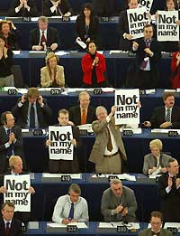 Members of the European Parliament hold placards with the slogan "not in my name" as others applaud, during a voting session on a report approving the E.U. constitutional treaty at the European Parliament in Strasbourg, January 12, 2004. [Reuters]