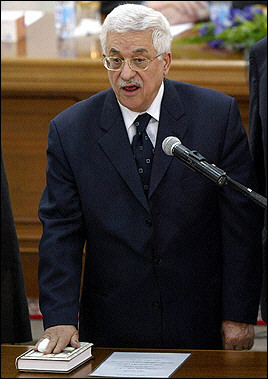 Newly installed Palestinian leader Mahmud Abbas takes the oath during his formal inauguration ceremony as president of the Palestinian Authority at the Muqataa in the West Bank city of Ramallah. [AFP]