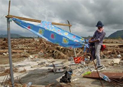 Zulfikar erects a makeshift tent on the site of his former home, Sunday, Jan. 16, 2005, in Lhoknga, a village on the outskirts of Banda Aceh, Indonesia. Zulfikar lost his mother, and seven brothers and sisters in the Dec. 26 tsunami. [AP]