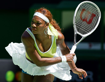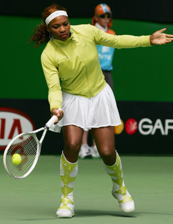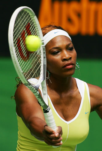 Serena Williams from the U.S. hits a forehand in her first round match against France's Camille Pin at the Australian Open tennis tournament in Melbourne January 17, 2004. Williams defeated Pin 6-1 6-1. [Reuters]
