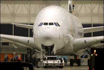 The first prototype of the A380 superjumbo in its hangar. Airbus officially lifted the curtain on its A380 -- the world's biggest passenger aircraft that will eclipse Boeing's 747 when it takes to the skies next year. [AFP]