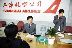 | Staff from Shanghai Airlines central ticket counter start to sell