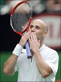 Eight seeded Andre Agassi of the US blows kisses to the crowd following his second round victory over Rainer Schuettler of Germany at the 2005 Australian Open in Melbourne. [AFP]