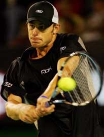 Andy Roddick of the U.S. makes a backhand return during his second round match against Britain's Greg Rusedski on Rod Laver Arena at the Australian Open at Melbourne Park, Melbourne, Australia, Thursday, Jan. 20, 2005. [AP]