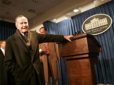 Former US President George H. W. Bush talks to the media during an impromptu visit of the Brady Press Briefing room at the White House, Saturday, Jan. 22, 2005 in Washington. [AP Photo]