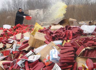 A police officer pours diesel oil on fireworks of low quality before setting them on fire in Xi'an, Northwest China's Shaanxi Province January 25, 2005. More than 2,000 trunk of fireworks were destroyed in the action. [newsphoto]