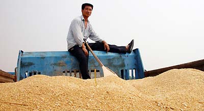 A farmer sits on a truck loaded with harvested grain in Anhui Province, East China. [newsphoto/file]