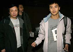 Olympic diving gold medalist Tian Liang[R] walks out of the training camp in Xi'an with coach Zhang Ting, January 26, 2005. [newsphoto]