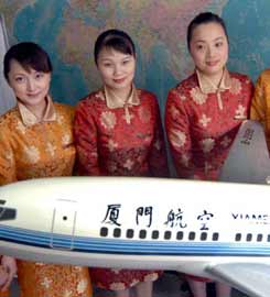 Attendants of Xiamen Airlines, in their newly designed uniforms, pose for a photo before an airliner model in Xiamen, East China's Fujian Province Thursday January 27, 2005. The attendants will work on the nonstop Taiwan-bound charter flights scheduled to start Saturday. [newsphoto]