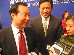 Wang Zaixi(L), deputy director of the State Taiwan Affairs Office, speaks to reporters after the briefing held by State Information Office. [newsphoto]