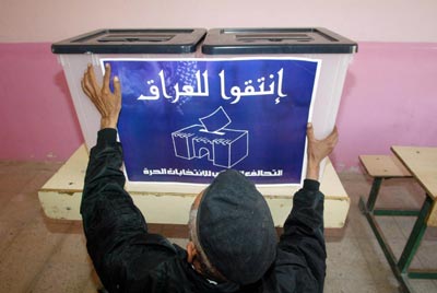 An Iraqi policeman places a voting poster onto the ballot boxes in a polling station in the centre of Az Zubayr, Iraq ahead of Sundays elections, January 29, 2005. [Reuters] |