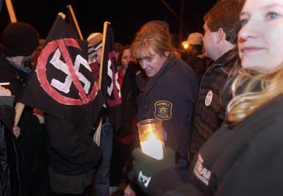 Outside the auction, Howell Mayor Geraldine Moen was among the protesters. She said the auction reignited stereotypes about the community. "Hate and its symbols do not belong in Howell," she said.