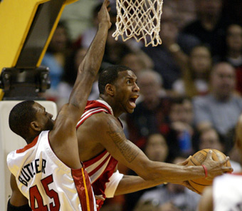 Tracy McGrady of the Houston Rockets (R) is defended by Miami Heat forward Rasual Butler during their NBA game in Miami, Florida January 30, 2005. [Reuters]