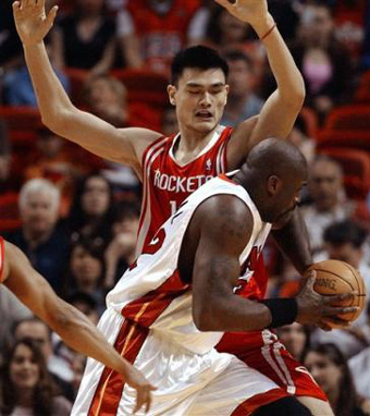 Houston Rockets center Yao Ming, of China, tries to block Miami Heat center Shaquille O'Neal Sunday, Jan. 30, 2005 in Miami. The Heat won 104-95. [AP]