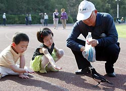 Li Daozhi, a Beijing resident, feeds a magpie with his grandchildren. [newsphoto/file]