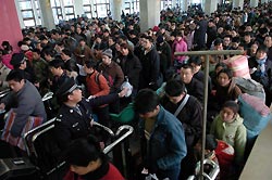 Passengers queue for tichket checks before boarding in the Beijing Railway Station on January 31, 2005. [Xinhua]