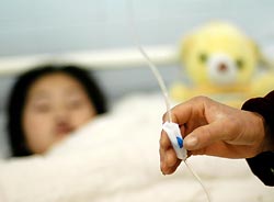 Relative of a Meningitis patient adjusts the injection in Dongtai, East China's Jiangsu Province, Feburary 1, 2005. [newsphoto]